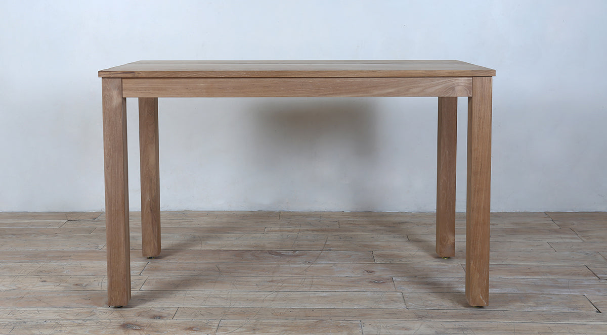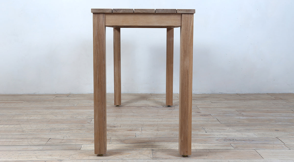 This outdoor dining bar table is made from solid teakwood, known for its strength and natural beauty. It features a simple rectangular top and sturdy square legs for a clean, modern look.