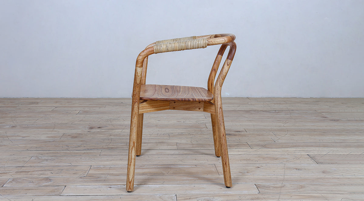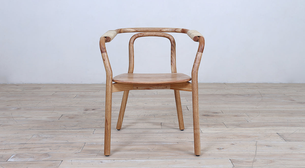 A sleek wooden armchair with a smooth curved frame and minimalist design. The natural wood finish and wrapped arm details give it a modern yet warm look, perfect for dining or living spaces.