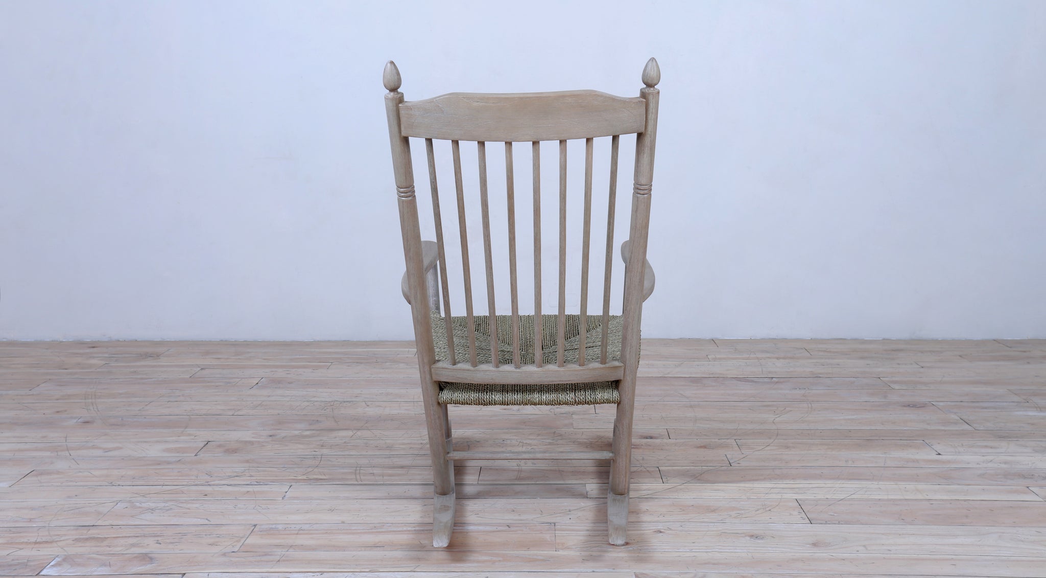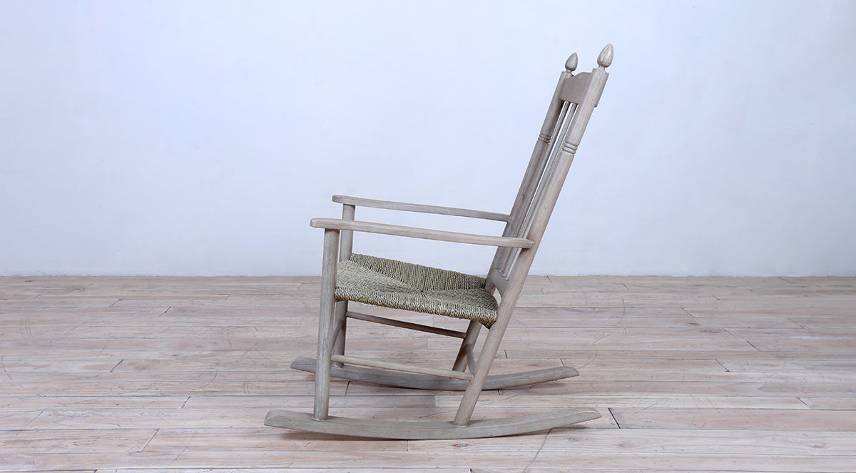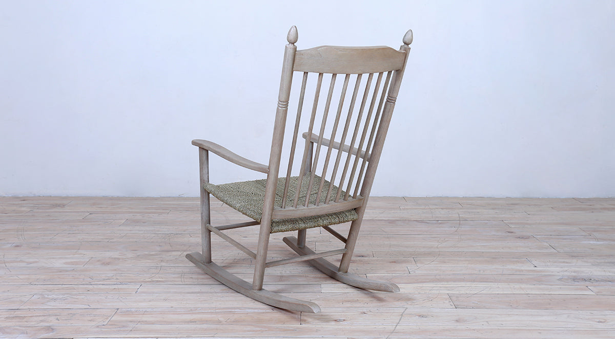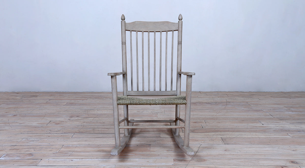 A classic wooden rocking chair with a tall spindle back, woven natural fiber seat, and smooth curved rockers. Finished in a rustic tone, it’s perfect for relaxed indoor or porch seating.