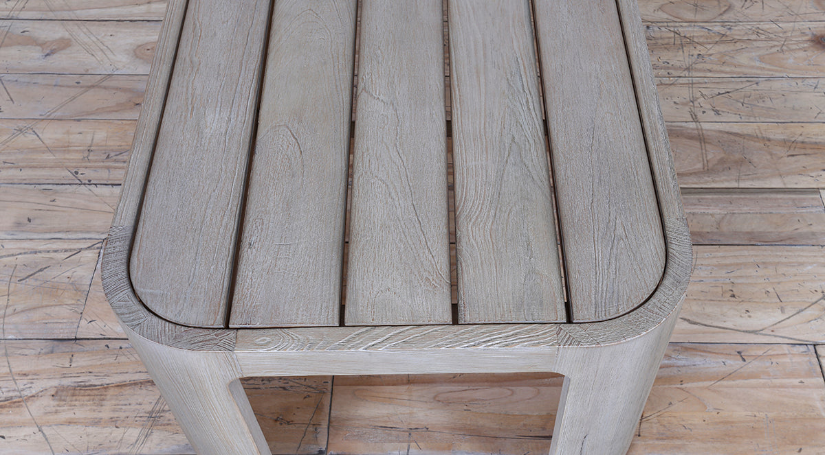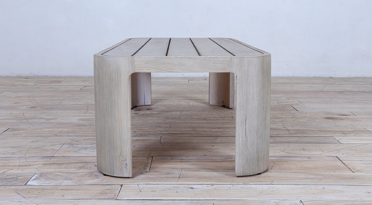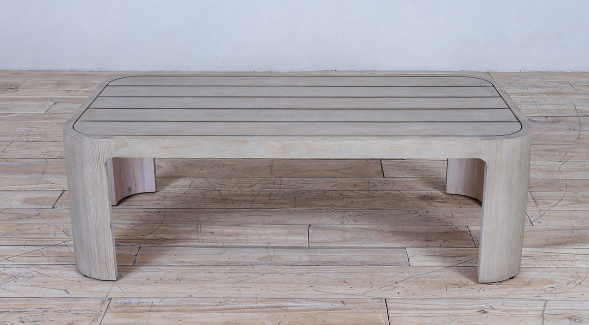 A sleek wooden coffee table with a natural finish, designed with clean lines and rounded corners. Its slatted top adds a modern touch, making it a perfect fit for indoor living spaces. Durable and stylish, this table blends seamlessly with both contemporary and minimalist interiors.